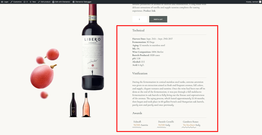 Click on the Edit with Elementor button in the Content section of the product in order to add its description and edit the fruit-background image: