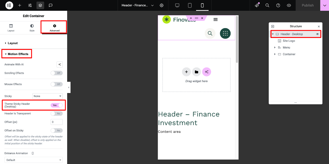 If you see the mobile and tablet header doubled, you must disable the Theme Sticky Header (Desktop) setting:
