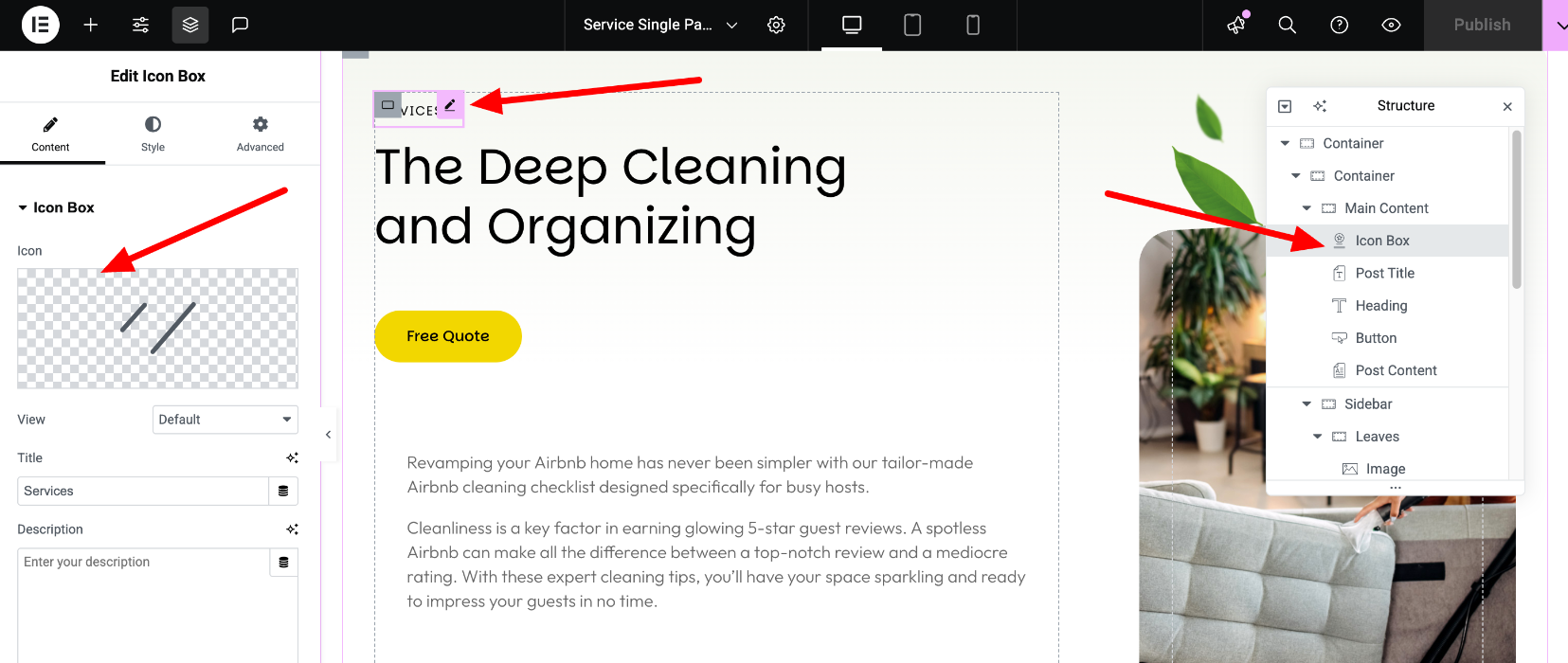 Edit the page's content easily, by locating each Elementor widget in the Navigator (The "Structure" section on the right)