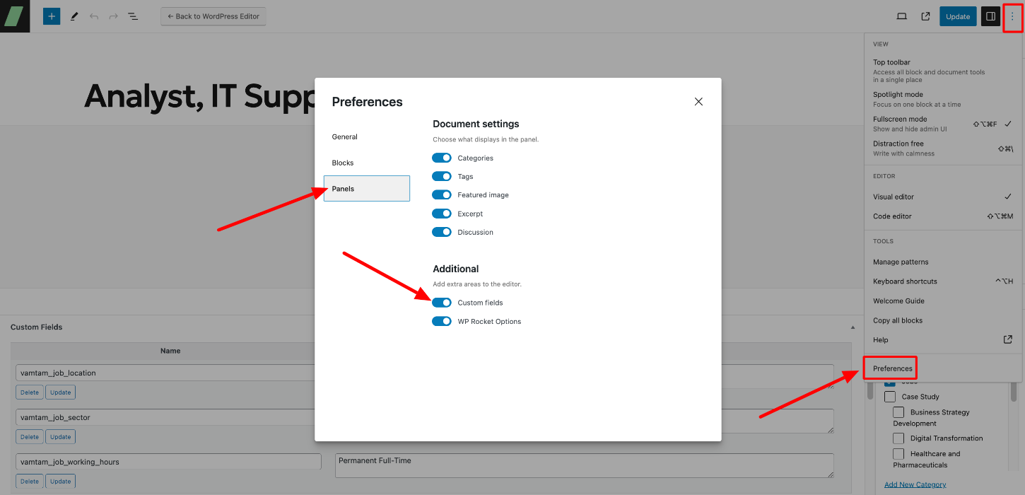 If you don't see the page's Custom Fields, click on Preferences > Panels > Additional > turn on the "Custom Fields" toggle: