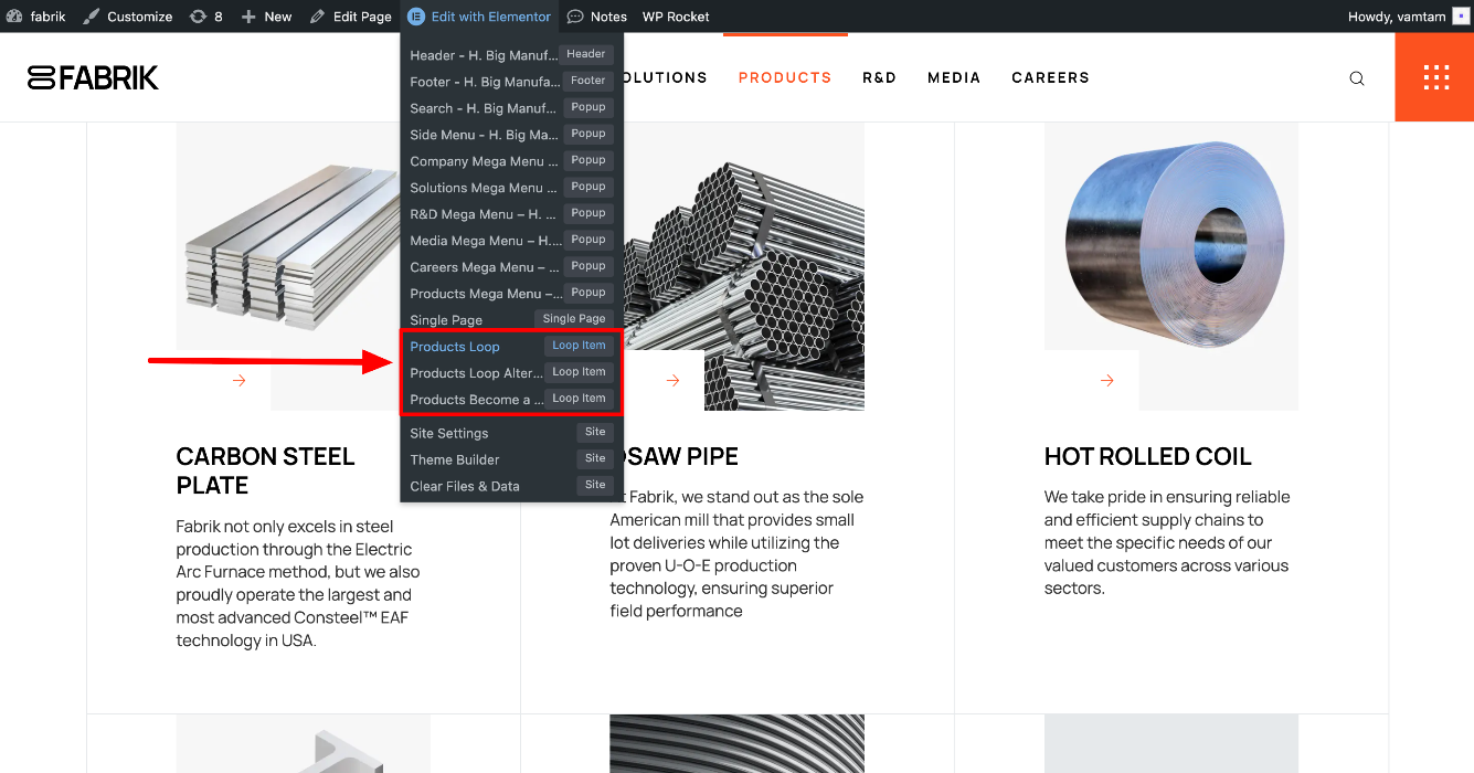 How to edit the main item template of the Products loop on https://fabrik.vamtam.com/products/ ?