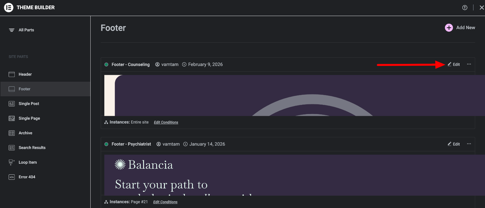 To begin, navigate to the Toolbar > Edit with Elementor > Footer (the name of the template may be different)